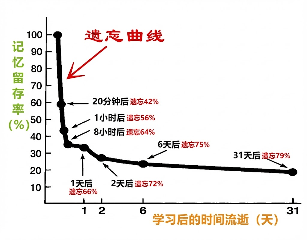 德国心理学家艾宾浩斯(Hermann Ebbinghaus)提出的“遗忘曲线”揭示了这一残酷的生理规律:在没有任何复习介入的情况下,学习者在接触新知识 20 分钟后,留存率仅为 58%;24 小时后,这一数字将跌至 33%。