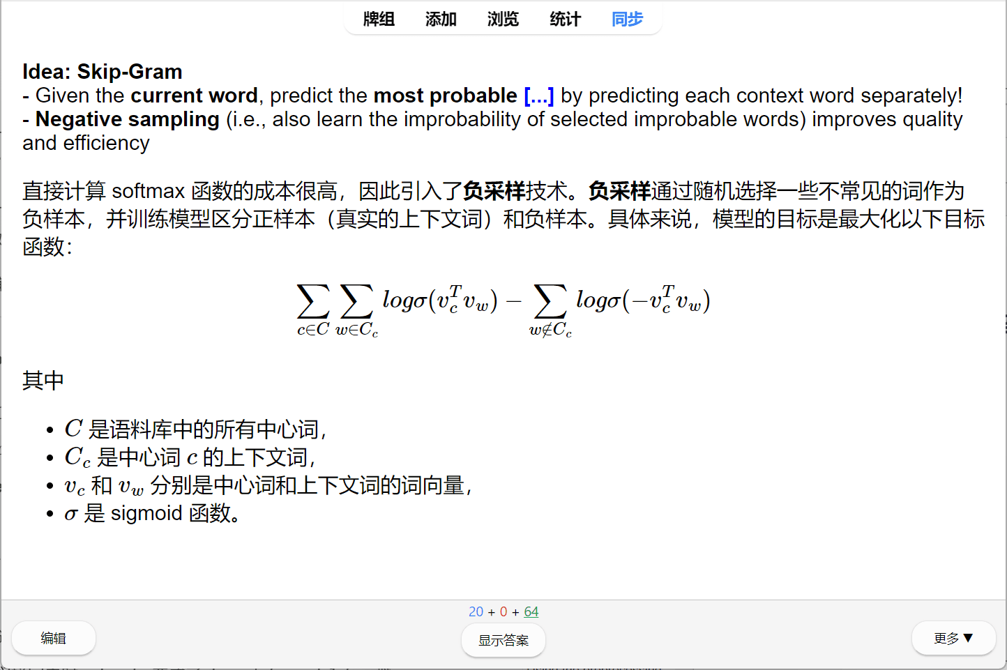 Anki 并不提供多选题,而是直接展示问题(正面)。卡片中的蓝色空格是填空内容,要求用户在脑海中检索答案,随后翻转卡片查看结果。同一张卡片可以挖出许多个这样的填空,使用者被迫一次次回忆缺失的内容。神经科学研究表明,这种“费力检索”的过程比被动阅读更能强化神经突触的连接。
