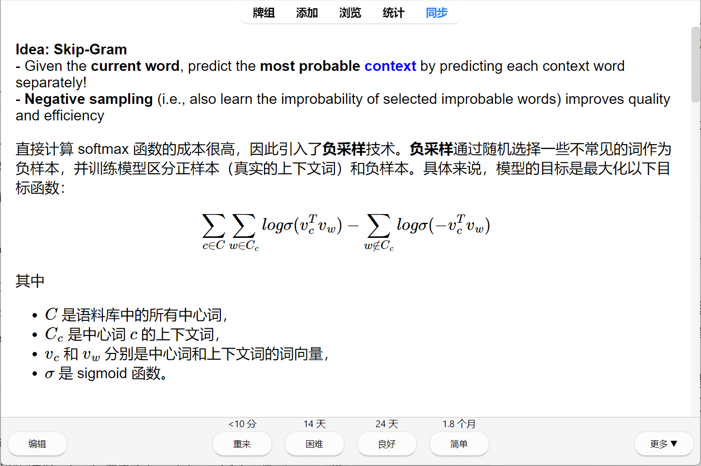 不同的选项代表用户对内容的记忆数据。用户的每一次点击,都是在向算法投喂数据。Anki 会根据反馈,自动计算出这张卡片下一次出现的精确日期。你不需要制定复习计划,算法就是你的计划。