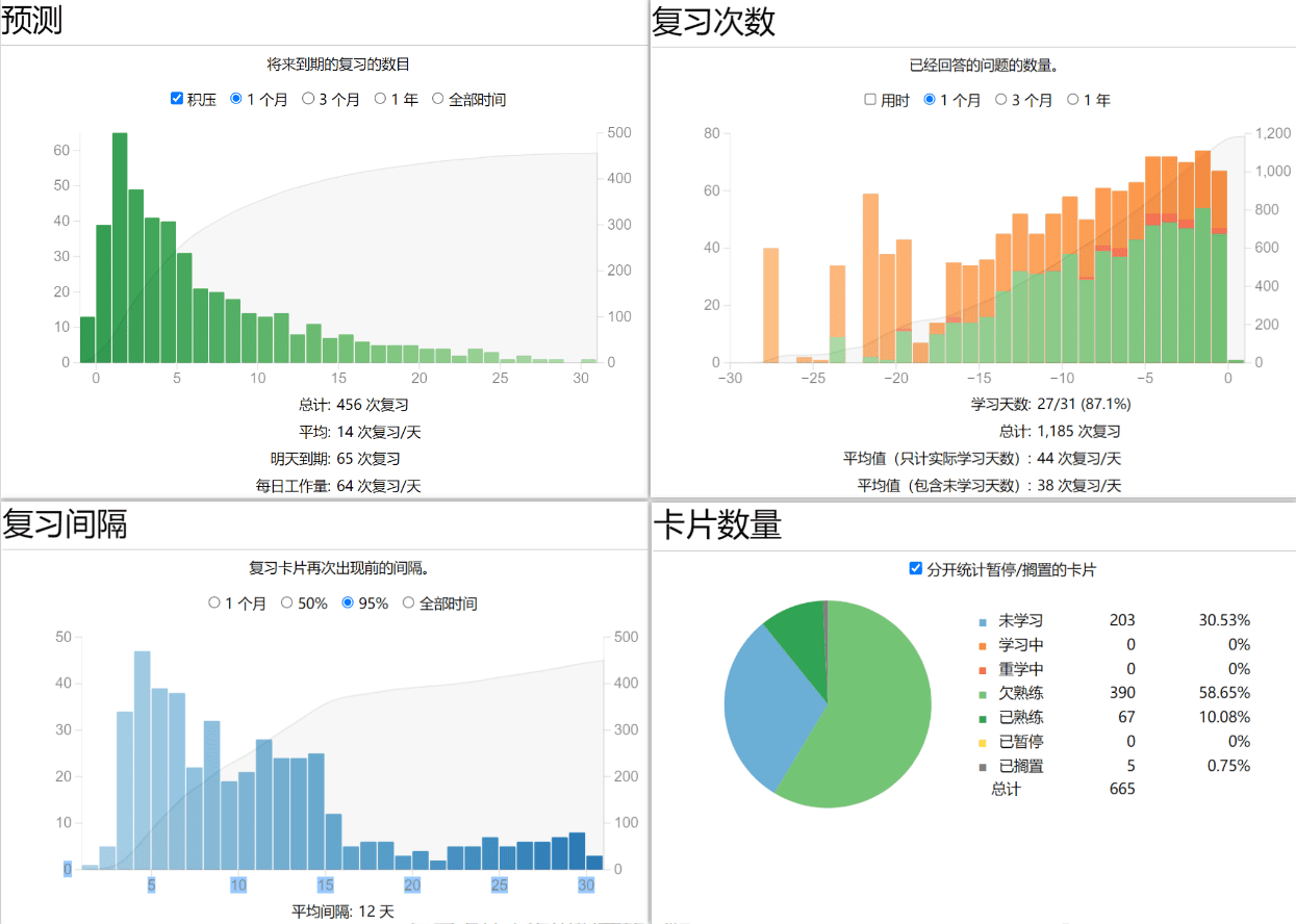 Anki 提供了详细的数据统计面板(如热力图、遗忘曲线图)。这种将隐性认知过程转化为显性数据图表的能力,能让学习者清晰地看到知识积累的“复利效应”。