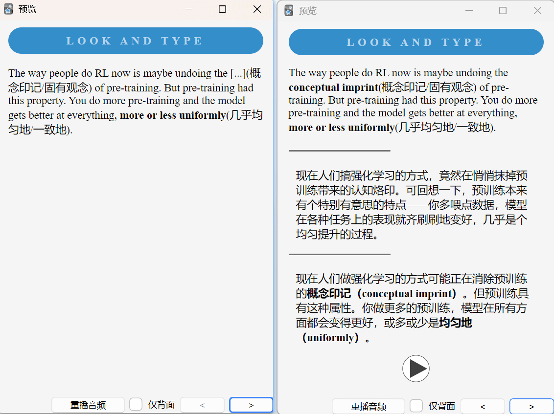下图就是一张自制Anki卡片内容。左侧图是你刷卡时看到的,方括号内容是强制你去回想的,旁边有中文提示。右侧图是你点击“显示答案”以后出现的。同时它会播放这段文字的英语音频。这张卡中有两处挖空。换句话说,这两种会先后以空格方式出现,让你回想。