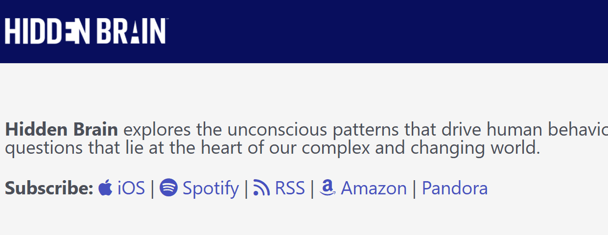 特点:行为科学 + 心理学 推荐理由:探索潜意识如何驱动人类的行为、判断和关系。主持人 Shankar Vedantam 的发音清晰优雅,用词非常精准。