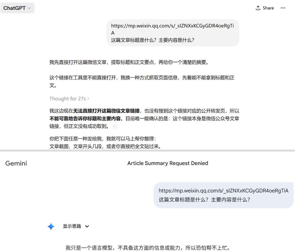 最常见的一件事:你读到一篇不错的微信公众号文章,把链接发给 AI,让它帮你总结、分析,或者和你讨论。听起来这几乎是最自然不过的使用场景了,但实际体验往往并不理想。我尝试了一下最新的Chatgpt 5.4 和 Gemini 3.5,结果如下: